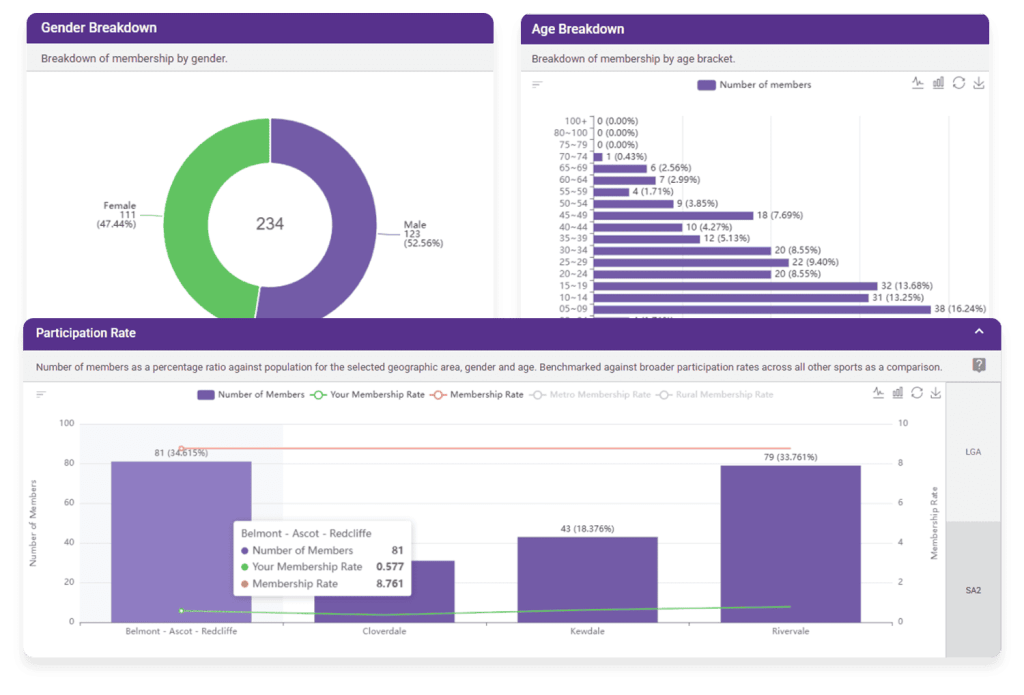 To help local sporting and recreation clubs make more informed decisions, the City of Belmont developed a series of bi-annual Club Profiles. These reports provide code-specific insights such as member demand, gender and age distribution, conversion rates and location-based trends.
