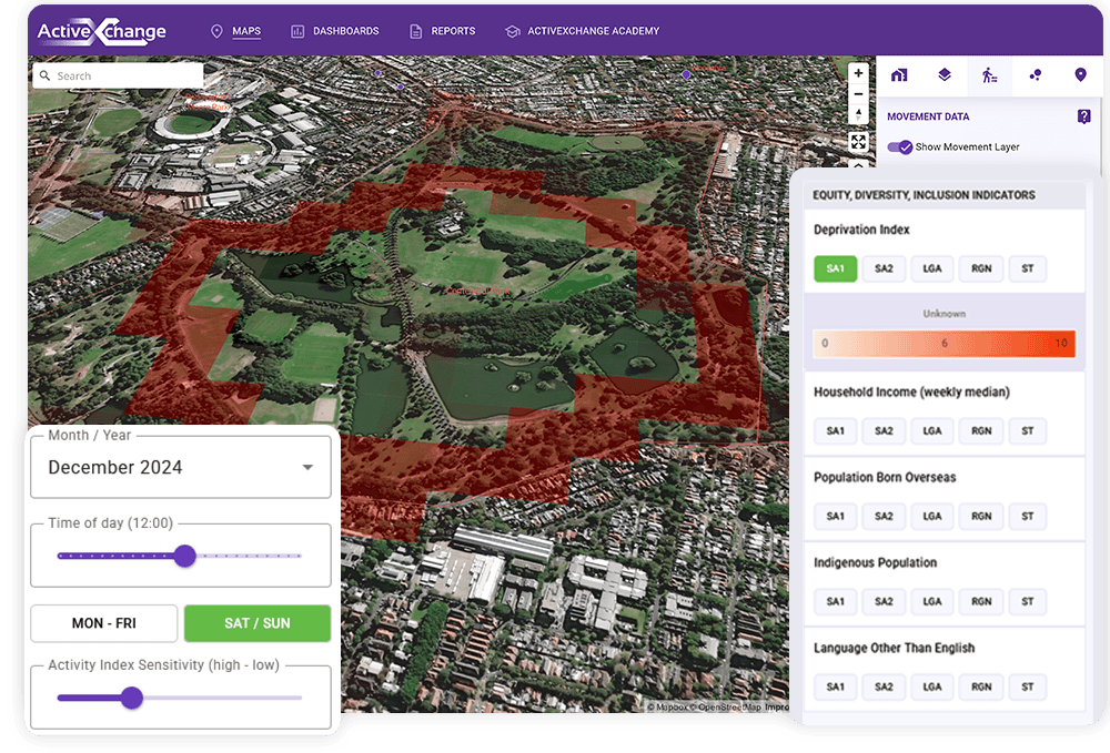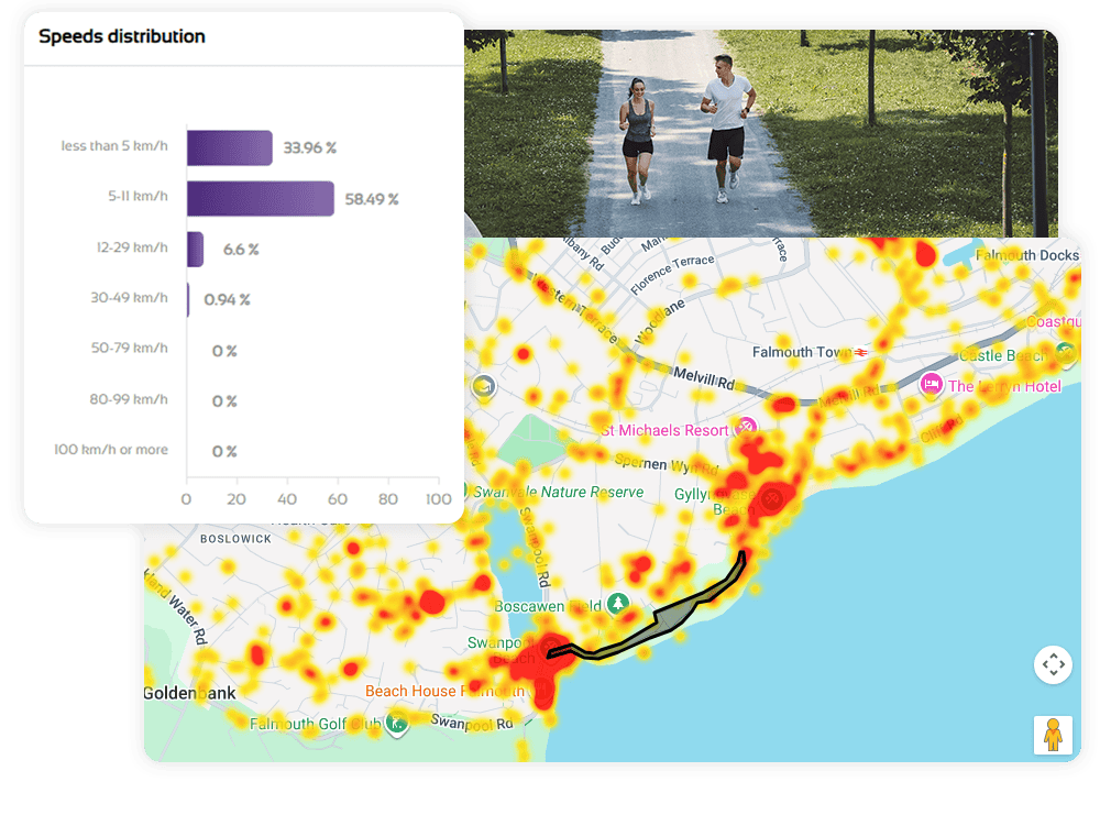 A platform tool for monitoring movement activity across an area over time, showing you where and when communities come together. Track how usage changes by year, month, day and hour across a collection of sites, or simply switch on the nationwide heat map to explore activity levels anywhere in your country. It’s the fastest way to spot patterns, compare locations and identify where activity is growing or declining.