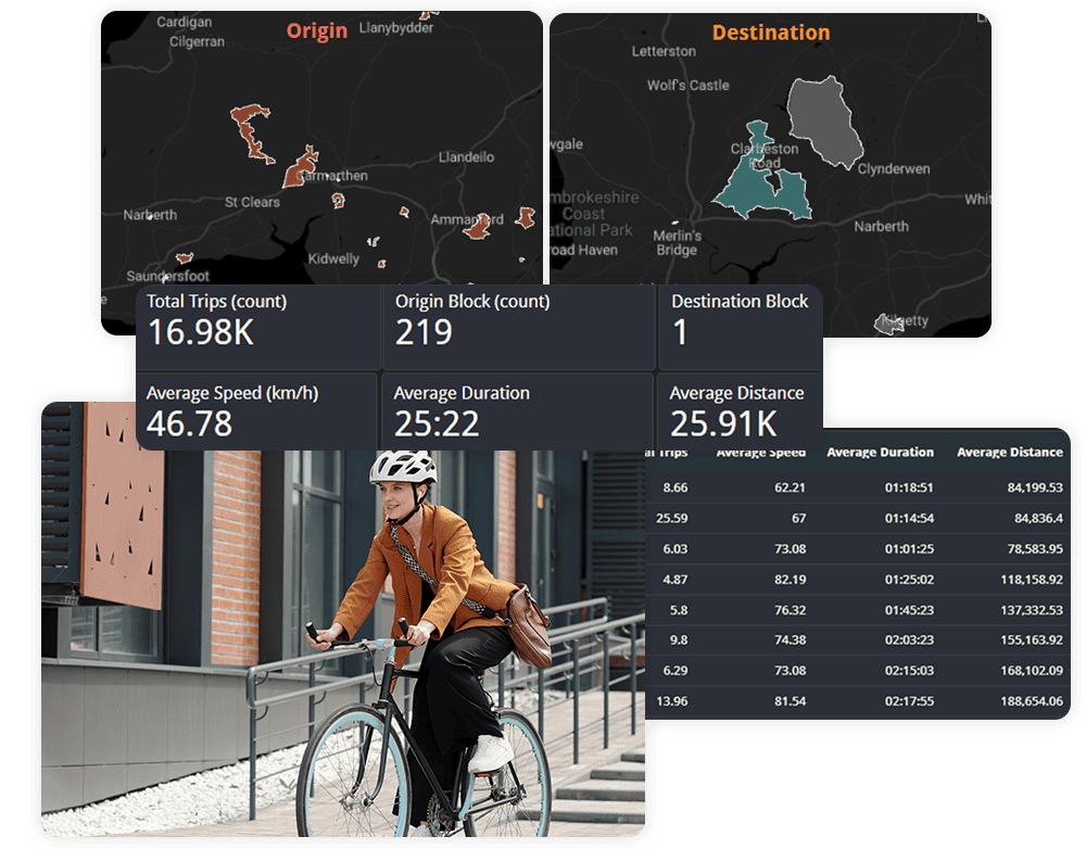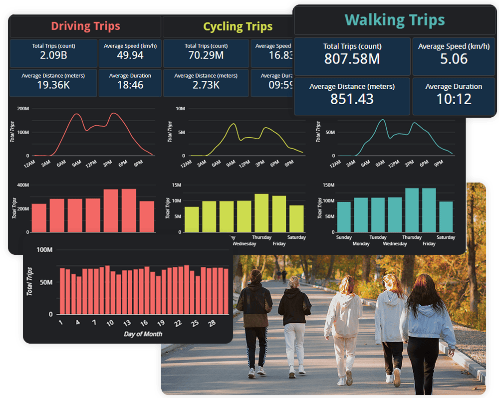 Understand overall travel behaviour across your region with a dashboard that aggregates billions of journeys to show how people move by walking, cycling and driving, helping you measure activity levels, infrastructure demand and travel patterns.