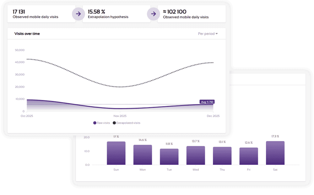 We do not have data from every mobile device, nor every person, who physically enters the polygon. Therefore, the visit estimates we generate are modeled in each instance, with a bespoke model created for each polygon.
